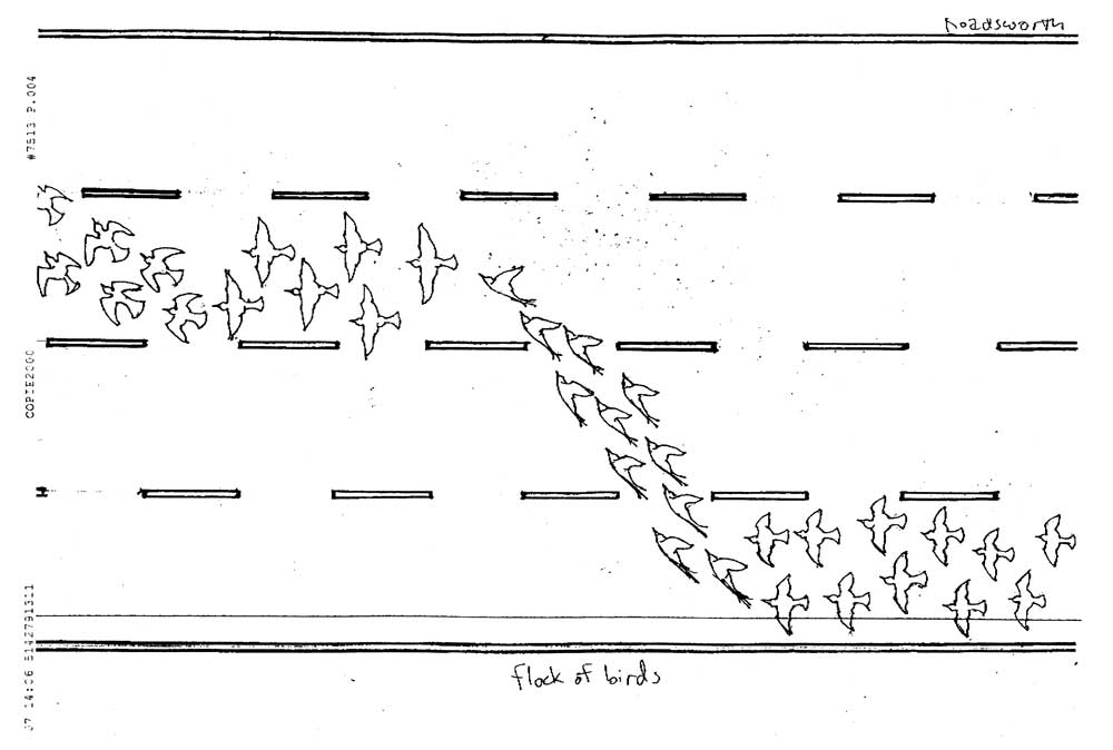 of fish morphing into flocks of birds into a pack of wolves into falling